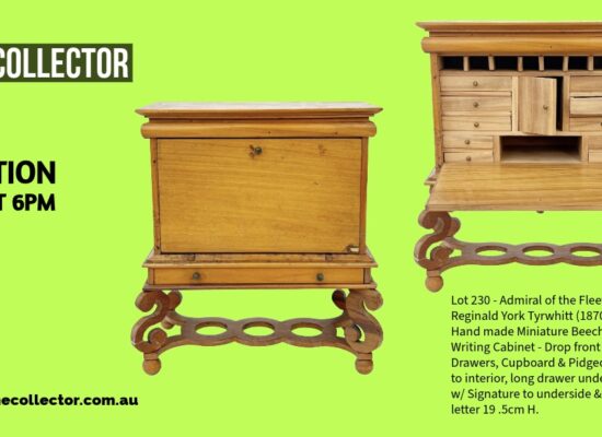On: Oct 24, 2025This auction includes a handmade miniature beech wood writing cabinet made by Admiral of the Fleet Sir...